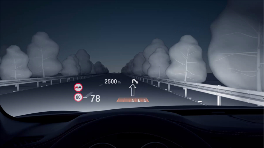Символы, проецируемые на лобовое стекло, отображаются в высоком разрешении и полном цвете. Проекция находится на расстоянии 2,3 м перед автомобилем и расположена оптимально. Поэтому информация считывается легко, удобно и так, что водитель почти совсем не отвлекается от дороги.