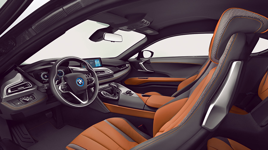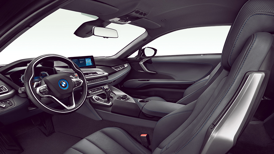 Интерьер BMW i8 Купе также подчеркивает его уникальный характер — в частности, благодаря эксклюзивной линии отделки Accaro цвета Амидо Медный. Формы и поверхности внутри автомобиля перекликаются со стремительными линиями кузова, создавая в кокпите атмосферу футуристичной динамики. Развернутый к водителю кокпит и интуитивное расположение органов управления обеспечивают максимальную ориентированность на водителя и легкость считывания информации и использования всех функций автомобиля. Новые спортивные сиденья с электрорегулировками обладают оптимальной боковой поддержкой и дарят максимальный комфорт. Светодиодная подсветка создает в салоне роскошную атмосферу в темное время суток. Декоративные контурные линии на дверях, приборной панели, центральной консоли и рулевом колесе могут быть подсвечены цветами Синий EfficientDynamics, Желтый Янтарь или Белый.